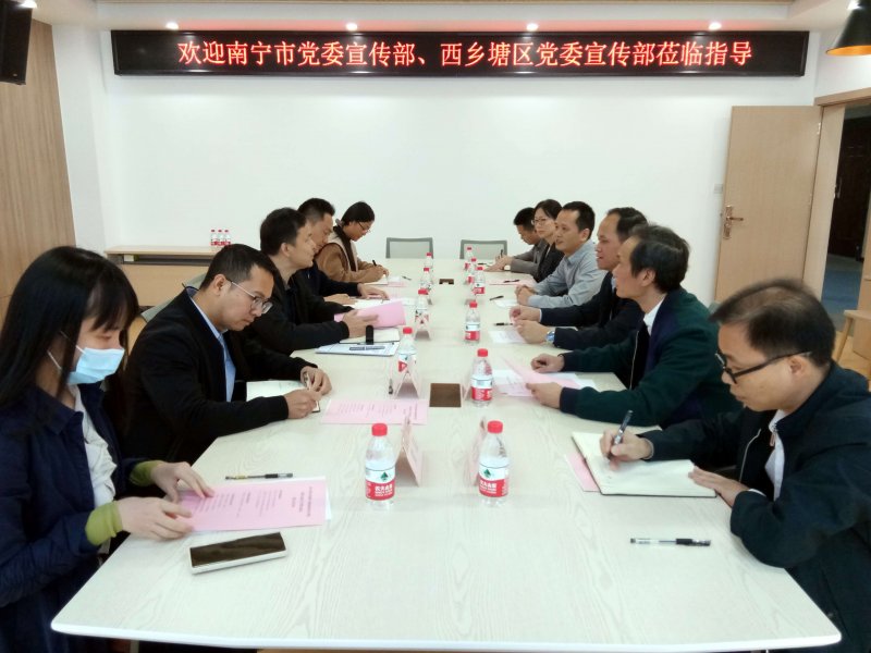 11月11日上午,南宁市委宣传部副部长苏东山,西乡塘区委常委、宣传部部长、副区长黄枝滔,以及南宁市委宣传部理论科和南宁市委讲师团成员等一行8人莅临我院,就共建马克思主义学院等事宜开展调研指导交流, 黄政艳副校长,我院班子成员及教师代表参加了交流会。