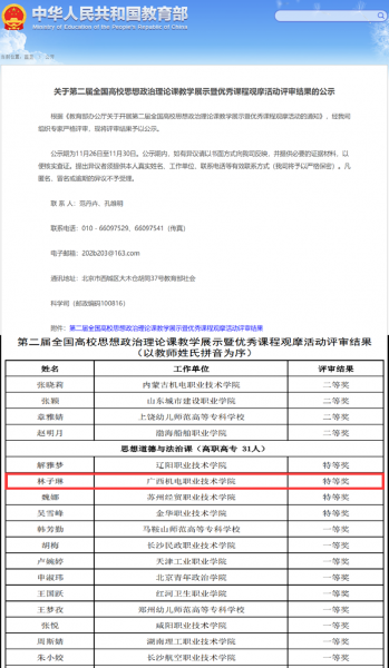 近日,教育部公布了第二届全国高校思想政治理论课教学展示暨优秀课程观摩活动评审结果,我院林子琳老师荣获高职高专组“思想道德与法治”课全国特等奖,是广西高职院校唯一、广西高校(含本科院校)唯二获得特等奖的教师。