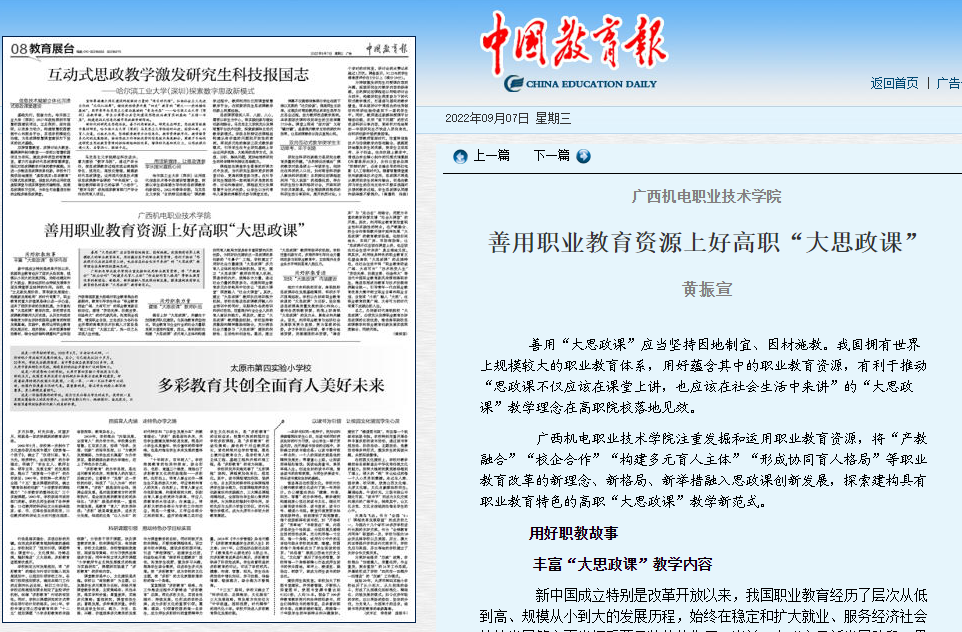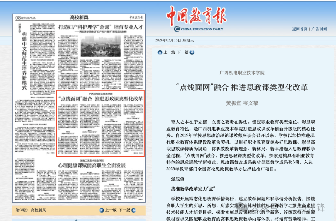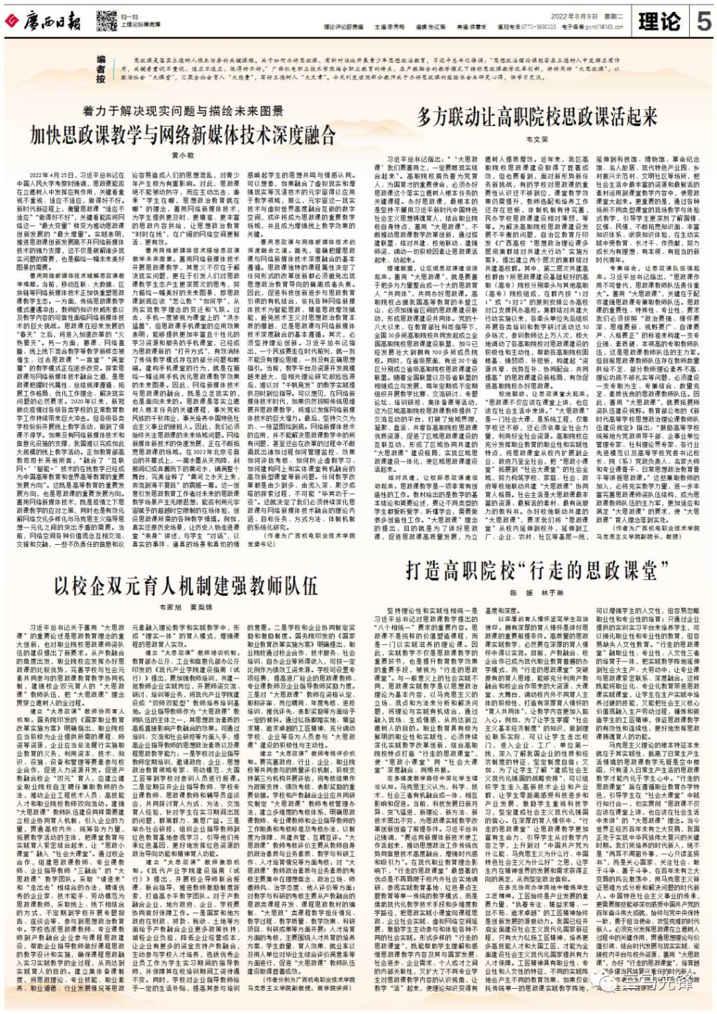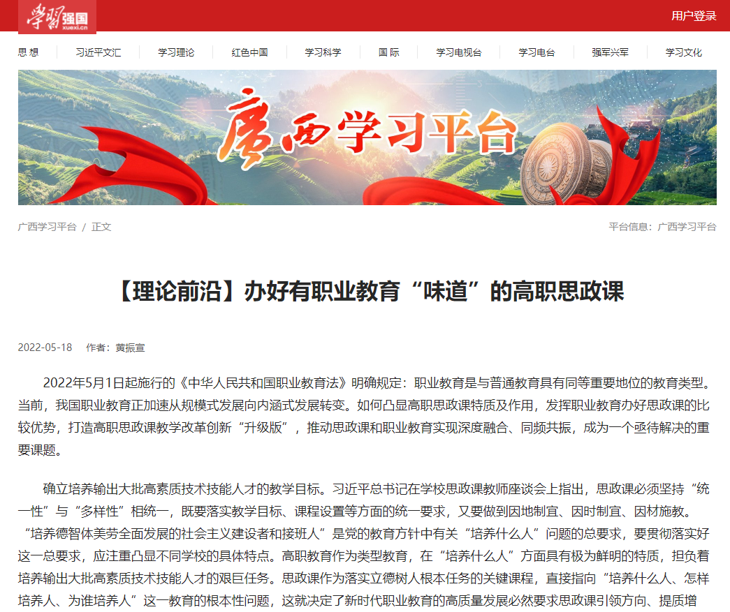 这五年,我院围绕铸牢中华民族共同体意识主线,结合职业教育的类型特色,聚焦高素质技术技能人才的培养,“点线面网”融合推进新时代高职思政课类型化改革,探索建构具有职业教育特色的思政课教学新模式。2019年以来,思政课教改成果连续三届获省部级教学成果奖3项,入选2023年教育部全国高校思政课教学方法择优推广项目。《广西日报》理论版整版刊发开云思政课教学改革经验。