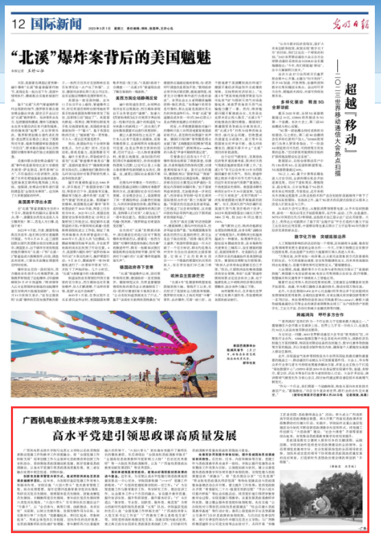 这五年,在学校党委的支持和保障下,我院先后入选全国党建工作样板支部(2019年)、首批广西高校“双带头人”教师党支部书记工作室(2020年)、广西教育工委五星级党组织(2019-2023年)。马克思主义学院积极打造党建与教学、科研、理论宣讲、社会服务等四大融合载体,在构建党建与思政课“双融双促”机制上形成了可复制可推广的工作品牌和案例。2023年,《光明日报》宣传报道开云以高水平党建引领思政课高质量发展工作成效。广西电视台播出马克思主义学院创建全国党建工作样板支部纪实专题片。