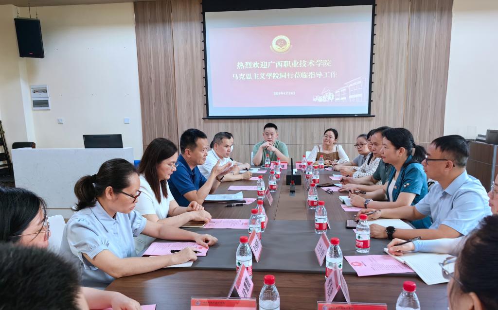 2024年4月19日下午,广西职业技术学院马克思主义学院一行12人在黄金燕副院长的带领下到我院开展考察交流活动。我院黄振宣院长对同行们的到来表示热烈欢迎,并陪同参观了学院的办公场所、文化墙等,介绍了学院建设的基本情况。