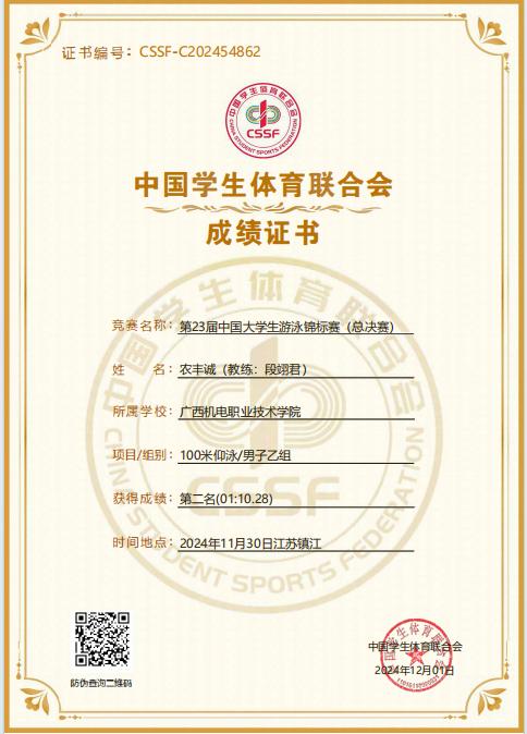 2024年11月,他以主教练身份带领学生征战两项国家级赛事,创下学校体育竞赛新佳绩:在第23届中国大学生游泳锦标赛(总决赛)中,指导学生夺得男子乙组100米自由泳、100米仰泳两项亚军;在中国大学生国防体育大赛总决赛中,团队奋勇争先,一举拿下主题演讲全国第一名、蛇形跑全国第二名等荣誉,让学校旗帜闪耀在全国赛场,为校赢得行业赞誉。