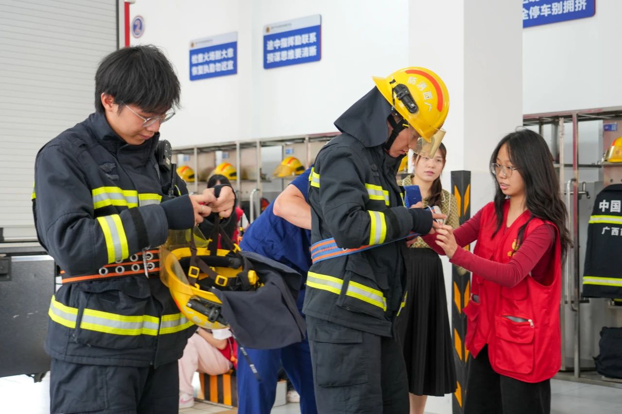 消防员细致讲解消防战斗服和隔热服的功能特性、穿戴要点及适用场景,并进行规范穿戴演示。随后,同学们纷纷尝试,在消防员一对一辅助下,完成消防战斗服和隔热服的穿戴体验。厚重的装备与繁琐的穿戴流程,让同学们真切体会到消防员在应急响应中争分夺秒的紧迫感与专业操作的严谨性。