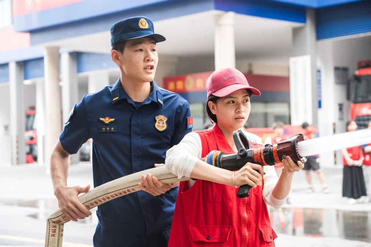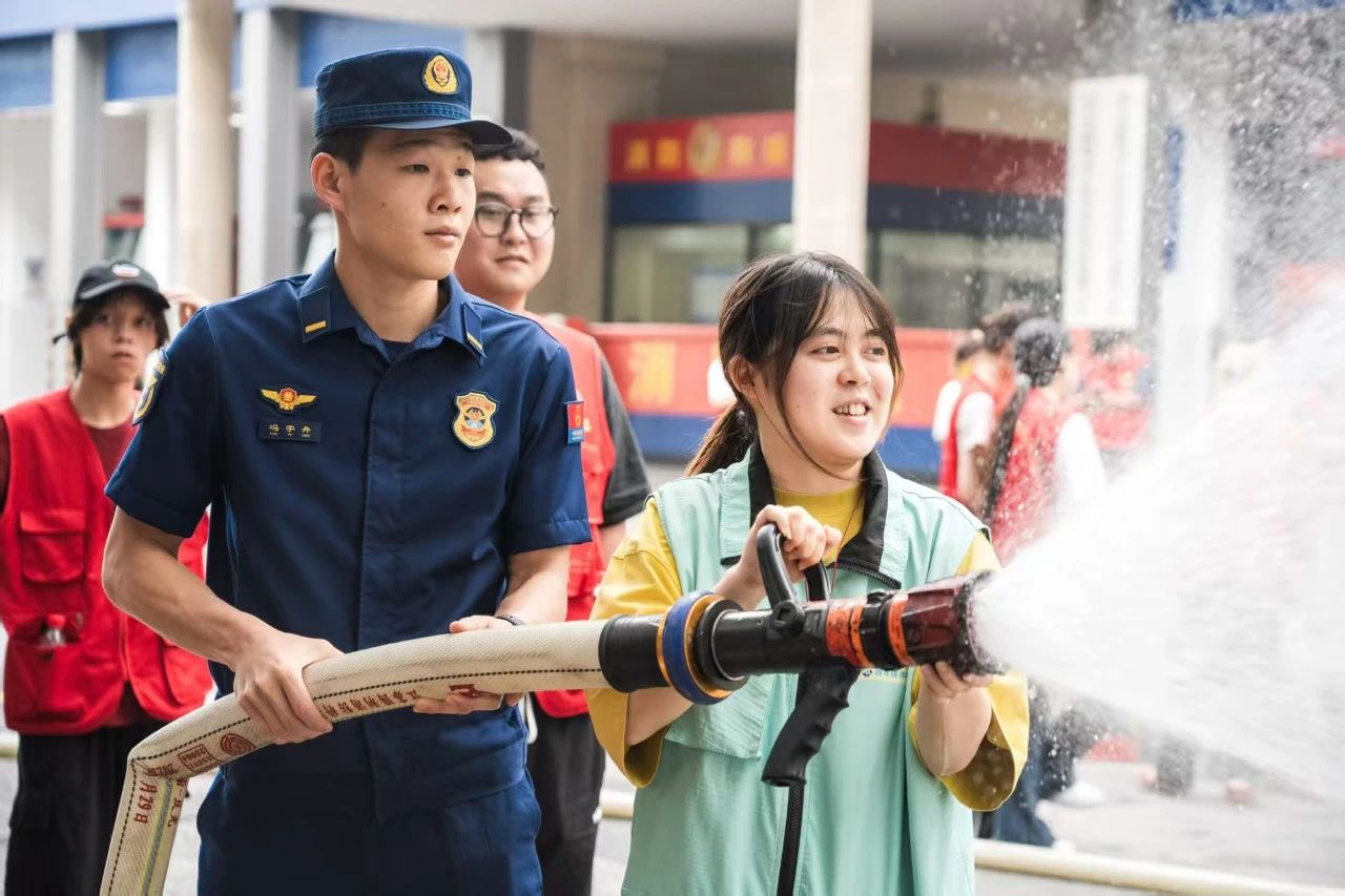 场地另一侧,消防水枪准备就绪。在消防员协助指导下,同学们体验了水枪的威力,轮流操作感受水流冲击力,学习水枪使用的模式切换及实际灭火操作,让同学们深入了解不同模式的消防水枪在实际灭火中的应用。