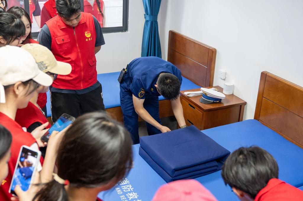 在生活区,消防员以一堂生动的内务整理课,向同学们诠释纪律与标准的力量。“三分叠,七分修”,消防员一边讲解叠被子口诀,一边展示操作要领,动作干净利落、精准到位。同学们认真观摩,深刻体会到消防员日常纪律重要性和严格标准的意义。
