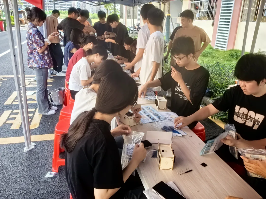 活动拉开帷幕,科技创意作品制作体验环节瞬间点燃了现场的热情。各学院学子热情高涨,踊跃报名参与,制作体验区域摆放着智能语音台灯、蓝牙音响、声控七彩灯、幸运大转盘等科创作品的制作材料与工具,承载着同学们对科技实践的期待。活动依托全国青年文明号电子科技协会开展,在协会成员的耐心指导下,同学们从了解作品原理、熟悉零件功能,到动手组装、调试,过程中专注研究图纸、相互交流技巧,遇到问题及时请教,现场弥漫着浓厚的探索与实践氛围。经过近两小时的努力,一个个精致实用的科创小作品在同学们手中诞生。当智能语音台灯亮起、蓝牙音响传出清晰音乐,同学们脸上满是成就感与喜悦。2025级新生纷纷表示,此次制作体验让他们真切感受到电子科技的魅力,激发了深入学习专业技能的兴趣,未来希望加入电子科技协会,系统学习更多科创知识,提升专业能力和实践本领。