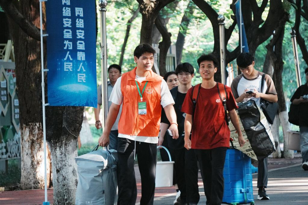 在地铁站、公交站,志愿者们举着印有学校标识的引导牌全天候值守接站,主动为新生搬运行李、讲解报到流程;校园内,各学院迎新点设置“咨询服务台”“行李临时存放处”,志愿者们化身“校园向导”,为新生指引报到窗口、宿舍位置、食堂超市等场所,从车站接站到校园报到、宿舍入住全流程护航。
