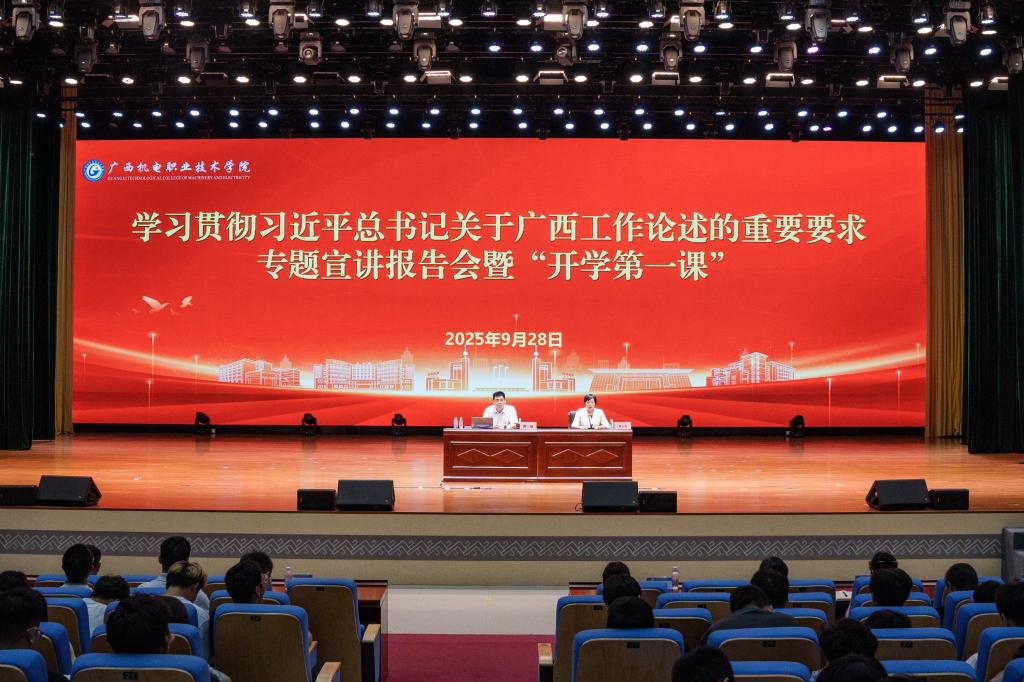9月28日,开云kaiyun官方网站学习贯彻习近平总书记关于广西工作论述的重要要求专题宣讲报告会暨“开学第一课”在相思湖校区弘毅楼大礼堂举行,校党委书记黄小敬以“弘扬伟大抗战精神做壮美广西建设的挺膺担当者”为题,为2025级新生讲授开学第一课。主会场设在相思湖校区弘毅大礼堂,相思湖校区、江南校区同步设立60个分会场,2025级新生和教师代表共9000余人通过现场参与或集中观看的方式聆听报告。活动由校党委副书记程云燕主持。