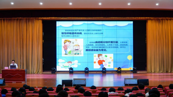 覃熙茂和钟永泉在艾滋病知识的讲解中,通过列举生动的事例、引用相关统计数据和震撼人心的图片,深入浅出地阐述了艾滋病的基本概念、传播途径以及检测与预防等核心内容。随后,在结核病知识的讲解部分,系统地介绍了该病的历史演变、传播途径、易感群体及实用预防方法,引导师生树立正确的疾病认知,积极主动地采取日常防护措施。