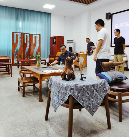 我系家具艺术设计专业以桂作家具传承项目为发展契机,以“大师领衔、校企共建、合作育人、共谋发展”为建设理念,率先与广西红木家具艺术研究会和广西桂作家具公司合作创建广西首个桂作家具大师工作室,并聘请“桂式家具第一人”、广西工艺美术大师梁紫童女士担任导师,致力于桂作家具理论构建、品牌传播、技艺传承和产品研发等实践活动。专业开设《民族系列家具产品开发实训》特色课程,将企业项目纳入课堂教学,挖掘广西民族文化素材,先后设计研发了“黑衣壮牛”、“梦古锦床”等独具西南少数民族文化风貌的新派桂式家具作品。