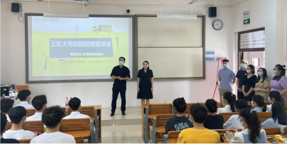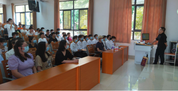 在宣讲会上,企业代表通过放映宣传片和PPT演示的方式,向同学们介绍企业规模、企业业务、企业文化、薪资待遇、员工晋升机制等多方面内容。学生们认真听吴经理的介绍,就具体的工作内容、薪资进行沟通。