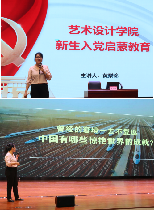 为深入学习贯彻习近平新时代中国特色社会主义思想,引导2023级新生深入了解党的百年光辉历史和伟大成就,激发学生入党愿望,端正入党动机,掌握党的基本理论和发展党员工作程序,9月26日晚上,艺术设计学院党委副书记黄梨锦在弘毅楼大礼堂给全体2023级新生开展了一场精彩的新生入党启蒙教育。