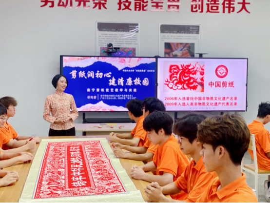 钟大师首先开讲,娓娓道来南宁剪纸的历史渊源、文化内涵和艺术特色,让大家对这项非遗技艺有了更为深入的了解。随后的实践互动环节,师生们在钟大师的细心指导下,动手体验剪纸艺术,从折叠到设计图案,再到小心翼翼地裁剪,每一个步骤都充满了探索与创造的乐趣。有的小组合作完成了寓意深刻的莲花图案,象征着“出淤泥而不染”的高洁情操;有的则剪出了“竹报平安”,借竹之坚韧表达清正廉洁的志向。每一件作品都是师生们对清廉文化的独特诠释和深情寄语。一刀一纸间,传统韵味与个人创意相得益彰,每一份作品的完成都是对非遗文化的致敬与传承。