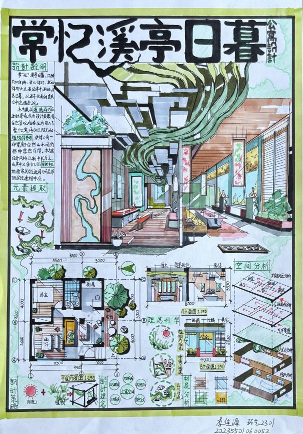 7月10日,艺术楼一楼成功举办了《手绘技法表现》课程的课业作品展。此次展览以“手绘·心绘 —— 灵感的纸上旋律”为主题,充分展示了环艺2301、2302班学生们在课程学习中的卓越成果与独特艺术创意。作品题材广泛,风格各异,包括家居空间设计、公共空间设计、景观设计等多个领域,共计展出50余件精心制作的作品。