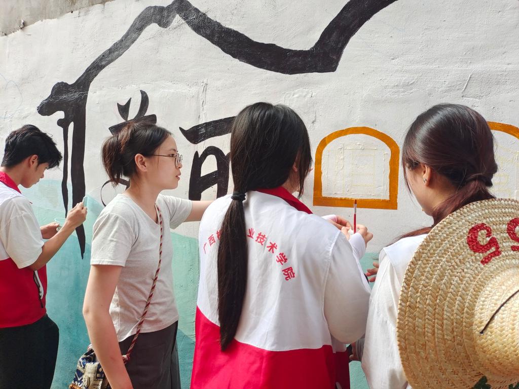 为深入学习党的二十届三中全会精神,推进乡村文化振兴,工业设计学院于7月15日-21日组织了一支由18名师生组成的社会实践团,奔赴学院定点结对帮扶村——玉林市博白县顿谷镇旧金村,开展“多彩墙绘绿美乡村·非遗漆扇传承文化”大学生暑期“三下乡”社会实践活动。在为期七天的实践活动中,实践团成员发挥设计专业优势,助力绘就全面推进乡村振兴的壮美画卷。