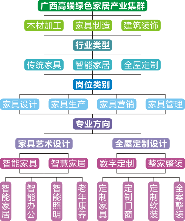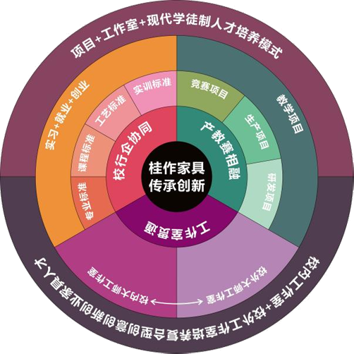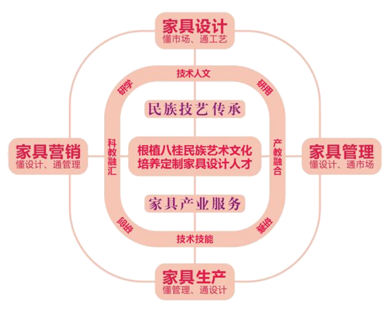 专业以“根植八桂民族艺术文化、依托机电智能制造技术、培养定制家具设计人才、服务广西林产工业升级”为理念,紧密对接广西高端绿色家具家居产业集群,开创了“校行企协同·工作室贯通·产教赛相融”培养模式,以及“四位一体·通专结合”教学模式。专业根据家具产业细分要求实行分方向培养,其中家具艺术设计专业聚焦“智能家具+智慧家居”,涵盖智能家居、智能办公、智能照明和老年康养等领域;家具艺术设计(全屋定制设计)专业聚焦“数字定制+整家整装”,涵盖定制家具、定制门窗、定制软装和全案整装等领域。
